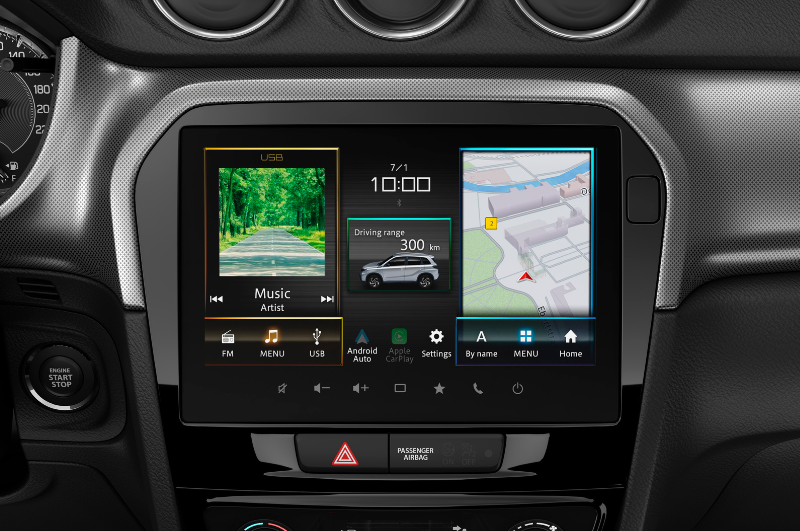 Още от ниво GL, VITARA е оборудван с Адаптивен круиз контрол (ACC) и Система за придържане в средата на пътната лента (LTA). Системата не само отчита зададената скорост и достатъчното разстояние от предното превозно средство, но и отчита ограниченията на скоростта, регистрирани от системата за разпознаване на пътни знаци.